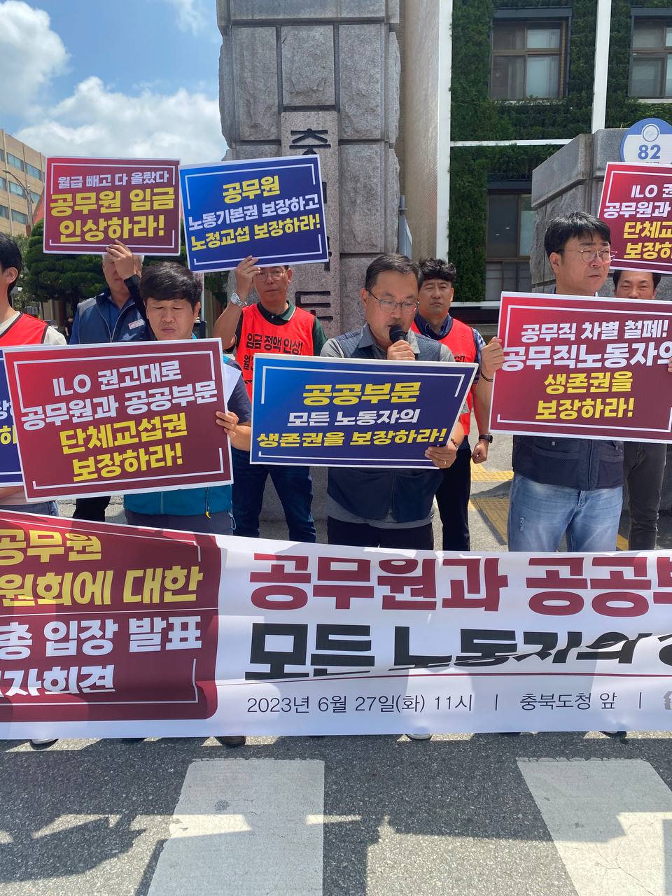 민주노총 충북본부는 27일 충북도청 서문앞에서 공무원 보수위원회에 대한 입장을 발표했다.