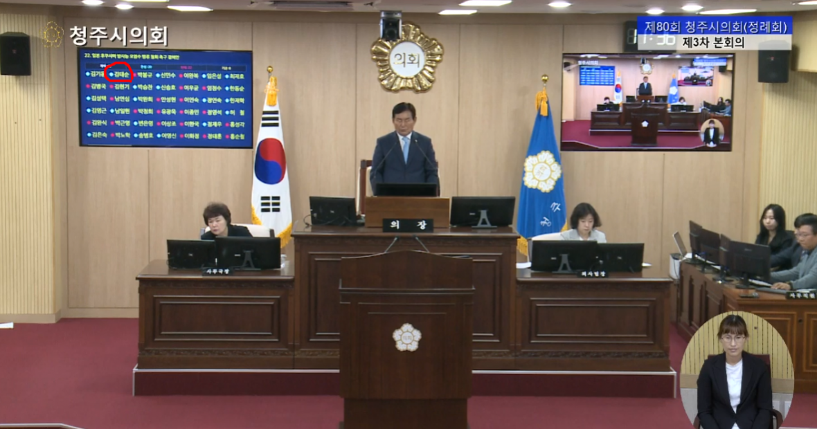 3일 청주시의회에 따르면 지난 달 29일 치러진 ‘일본 후쿠시마 방사능 오염수 방류철회 촉구 결의안’ 투표에서 국민의힘 김태순 시의원의 표결결과가 당초 찬성에서 반대로 정정됐다.