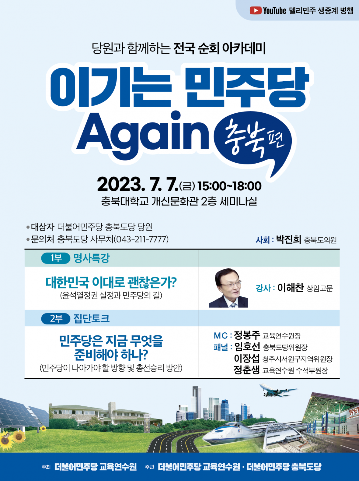 민주당은 이어 7일 오후 3시부터는 충북대 개신문화관 2층 세미나실에서 ‘이기는 민주당 어게인 충북편’ 이라는 전국 순회 아카데미를 개최한다.