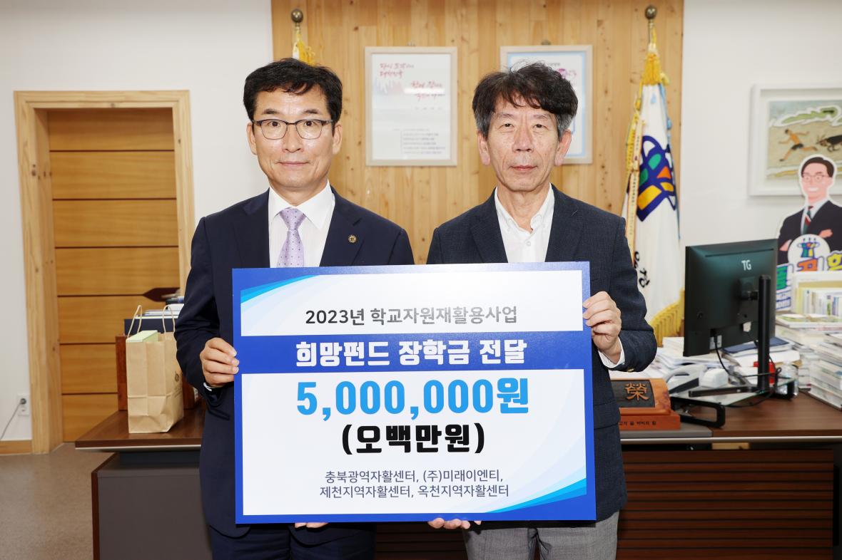 충북교육청(교육감 윤건영)은 충청북도광역자활센터(센터장 박재국)가 공동으로 추진하는 학교자원 재활용 사업을 통해 희망펀드 장학금 500만원을 기탁했다고 6일 밝혔다.