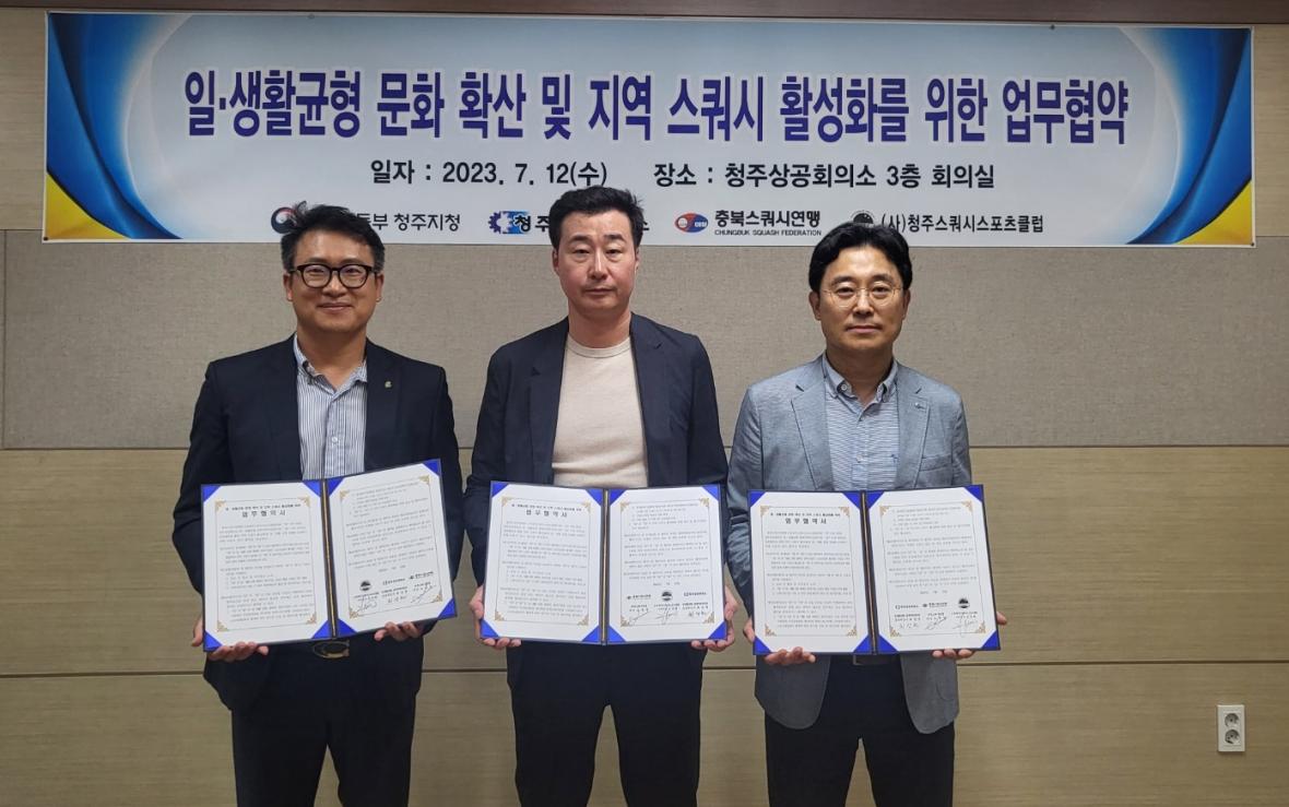 청주상공회의소(회장 이두영) 일‧생활균형 충북지역추진단은 12일 상의회관 3층 회의실에서 충북스쿼시연맹, (사)청주스쿼시스포츠클럽과 일‧생활균형 문화 확산 및 지역 스쿼시 활성화를 위한 업무협약을 체결했다.