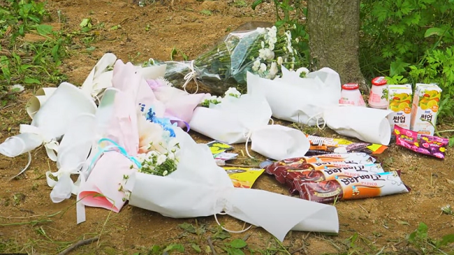 2021년 오창 여중생 투신현장에 놓인 꽃다발들