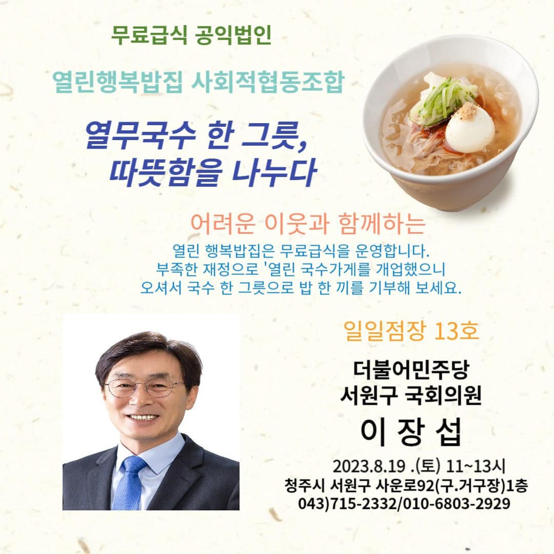한편, 이 의원은 오는 19일 청주 열린행복밥집 사회적협동조합에서 일일점장으로 봉사한다.