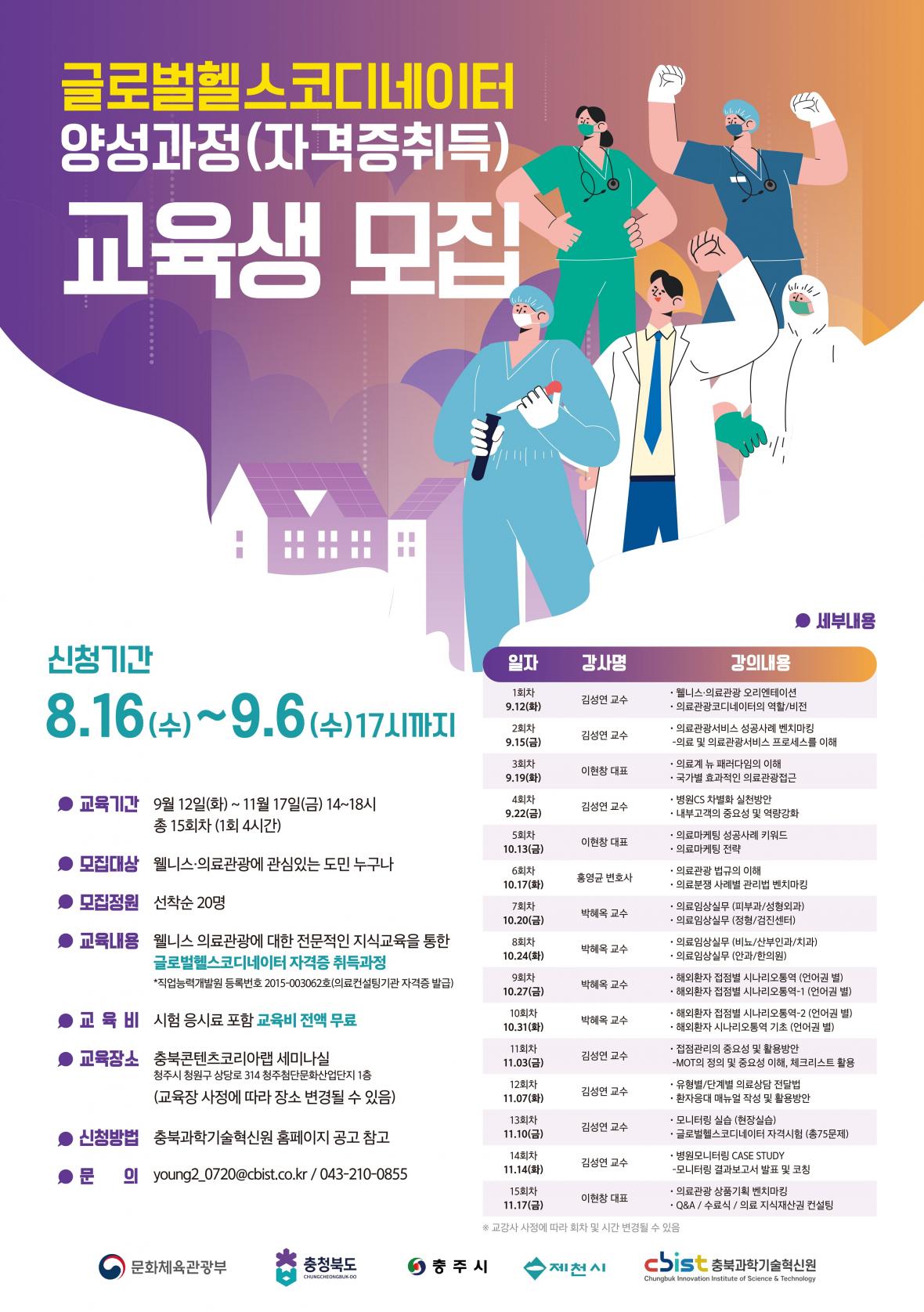 충북과학기술혁신원(원장 김상규)이 충청권 최초로 치료와 관광 목적으로 우리 지역을 찾는 외국인 의료관광객에게 맞춤형 의료 서비스와 체류 일정 등을 제안하고 관리하는 웰니스ㆍ의료관광 국제전문가 ‘글로벌헬스코디네이터’양성과정을운영한다고 24일 밝혔다.