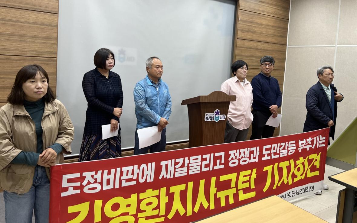 충북시민단체연대회의는 “김 지사는 취임 때부터 차 없는 도청, 친일 발언, 산불 발언, 오송 참사, 인사 문제, 복도 사진전, 충북학사 반상 차별, 청남대 무인도 개발과 같이 즉흥적이고 다듬어지지 않은 정책과 발언으로 많은 논란을 만들어왔었다”면서 “김영환 지사는 치졸한 방법으로 도민을 분열시키며, 정쟁으로 충북지역사회를 혼란케 하고, 도정에 대한 비판과 견제에 재갈을 물리고 있다”고 비판했다.