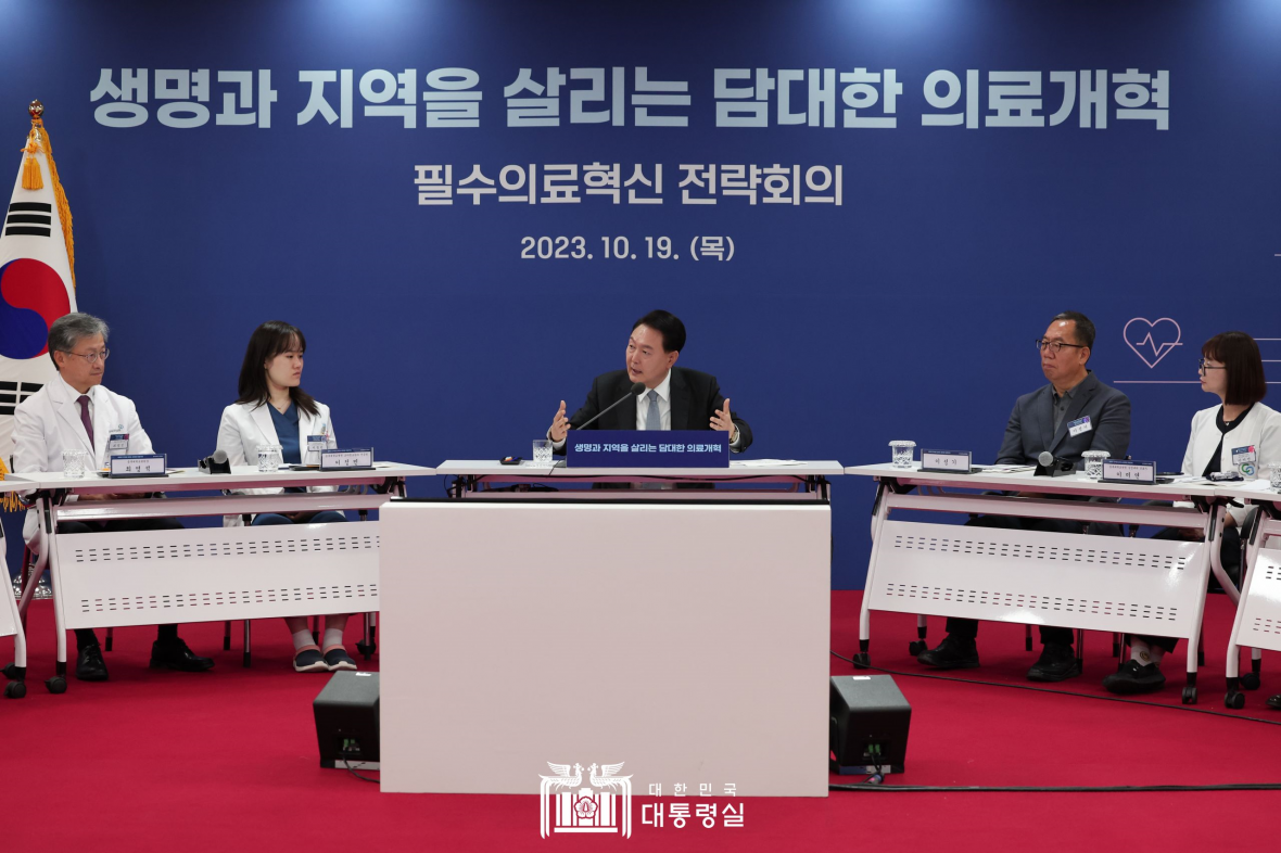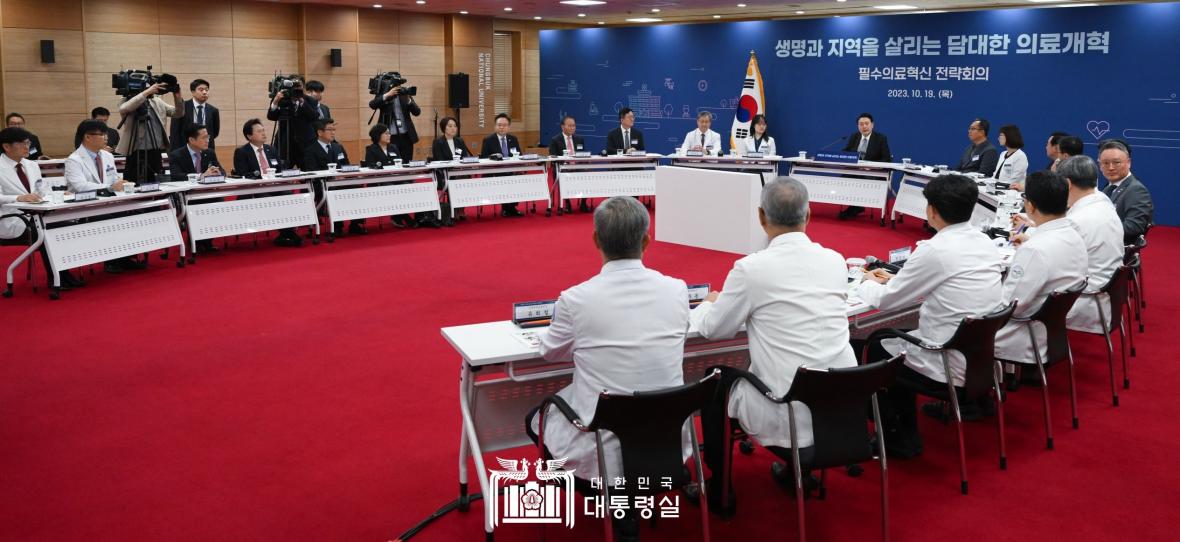 윤석열 대통령이 19일 충북대 개신문화관에서 '생명과 지역을 살리는 필수의료 혁신 전략회의'를 주재했다.