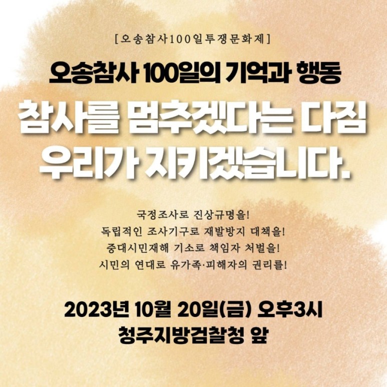 오송참사시민대책위는 오송참사 100일을 맞아 20일 오후 3시 청주지검 앞에서 오송참사 100일 투쟁문화제 ‘오송참사 100일의 기억과 행동’을 개최한다.
