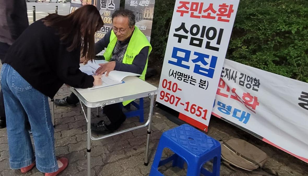 김영환지사 주민소환투표에 서명하는 주민의 모습.