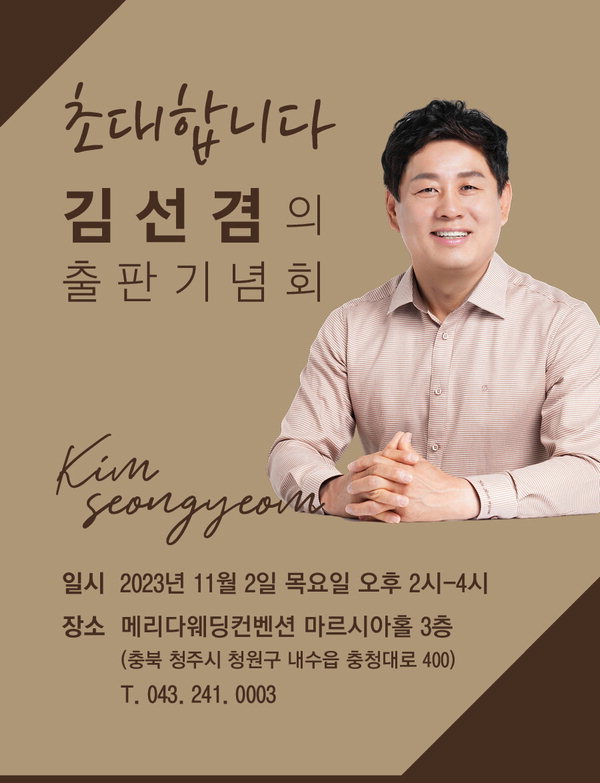 내년 총선에서 국민의힘 청주청원구 출마를 준비하고 있는 김선겸 청주시기업인협의회장이 출판기념회를 연다.