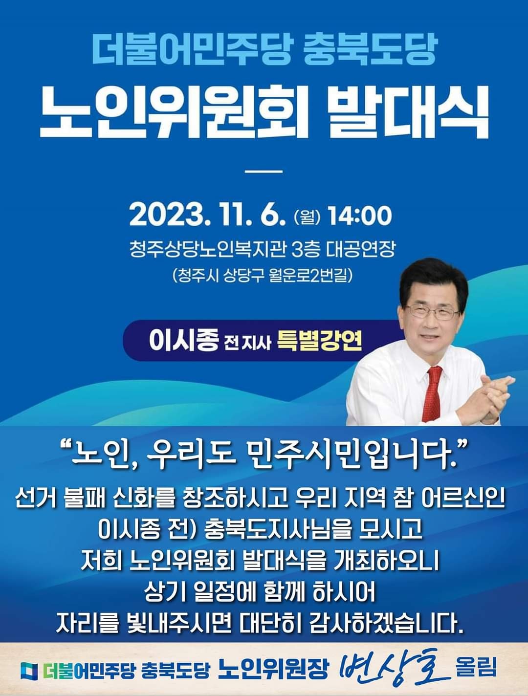 민주당 충북도당 노인위훤회는 ‘선거불패를 창조하고 우리지역 참 어른인 이시종 전 지사를 모시고 발대식을 개최한다’고 홍보했다.
