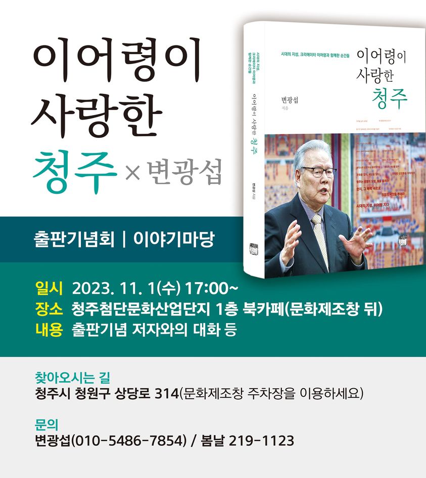<이어령이 사랑한 청주> 출판기념회는 다음 달 1일 오후 5시 청주첨단문화산업단지(문화제조창 뒷건물) 1층 북카페에서 열린다.