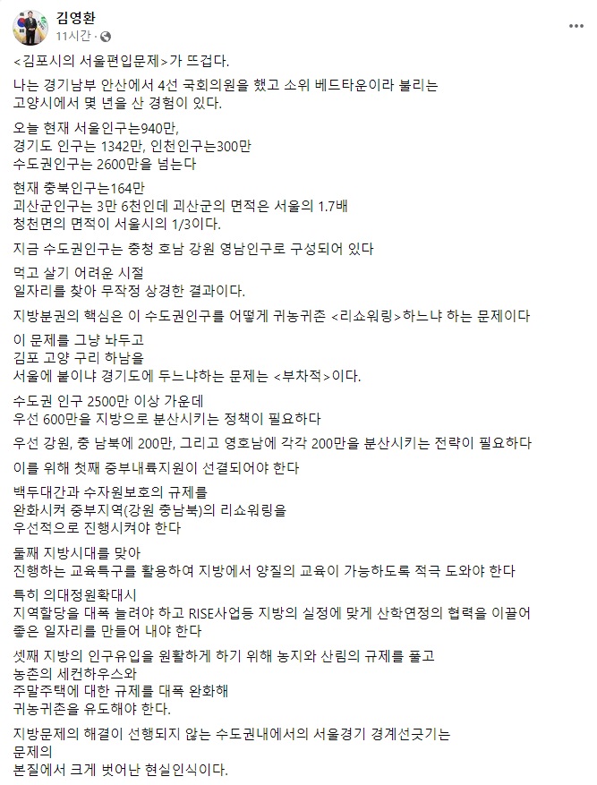 김영환 충북지사가 경기도 김포시의 서울편입 논란과 관련해 처음으로 입장을 밝혔다.