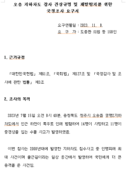 ‘오송 지하차도 참사 진상규명 및 재발방지를 위한 국정조사 요구서’는 도종환 의원(청주흥덕) 등 168명이 요구자로 서명했다.