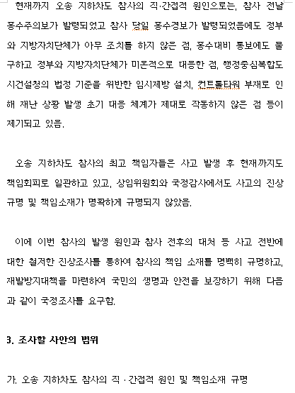 이들은 오송참사 국정조사요구서에서 “오송 지하차도 참사의 최고 책임자들은 사고 발생 후 현재까지도 책임회피로 일관하고 있고, 상임위원회와 국정감사에서도 사고의 진상규명 및 책임소재가 명확하게 규명되지 않았다”면서 “이에 이번 참사의 발생 원인과 참사 전후의 대처 등 사고 전반에 대한 철저한 진상조사를 통하여 참사의 책임 소재를 명백히 규명하고, 재발방지대책을 마련하여 국민의 생명과 안전을 보장하기 위해 국정조사를 요구한다”고 밝혔다.