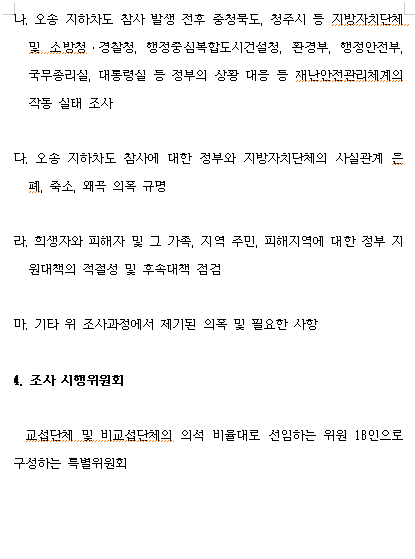 국정조사 범위는 △오송 지하차도 참사의 직ㆍ간접적 원인 및 책임소재 규명 △오송 지하차도 참사 발생 전후 충청북도, 청주시 등 지방자치단체 및 소방청ㆍ경찰청, 행정중심복합도시건설청, 환경부, 행정안전부, 국무총리실, 대통령실 등 정부의 상황 대응 등 재난안전관리체계의 작동 실태 조사 △ 오송 지하차도 참사에 대한 정부와 지방자치단체의 사실관계 은폐, 축소, 왜곡 의혹 규명 △희생자와 피해자 및 그 가족, 지역 주민, 피해지역에 대한 정부 지원대책의 적절성 및 후속대책 점검 △기타 위 조사과정에서 제기된 의혹 및 필요한 사항이다.