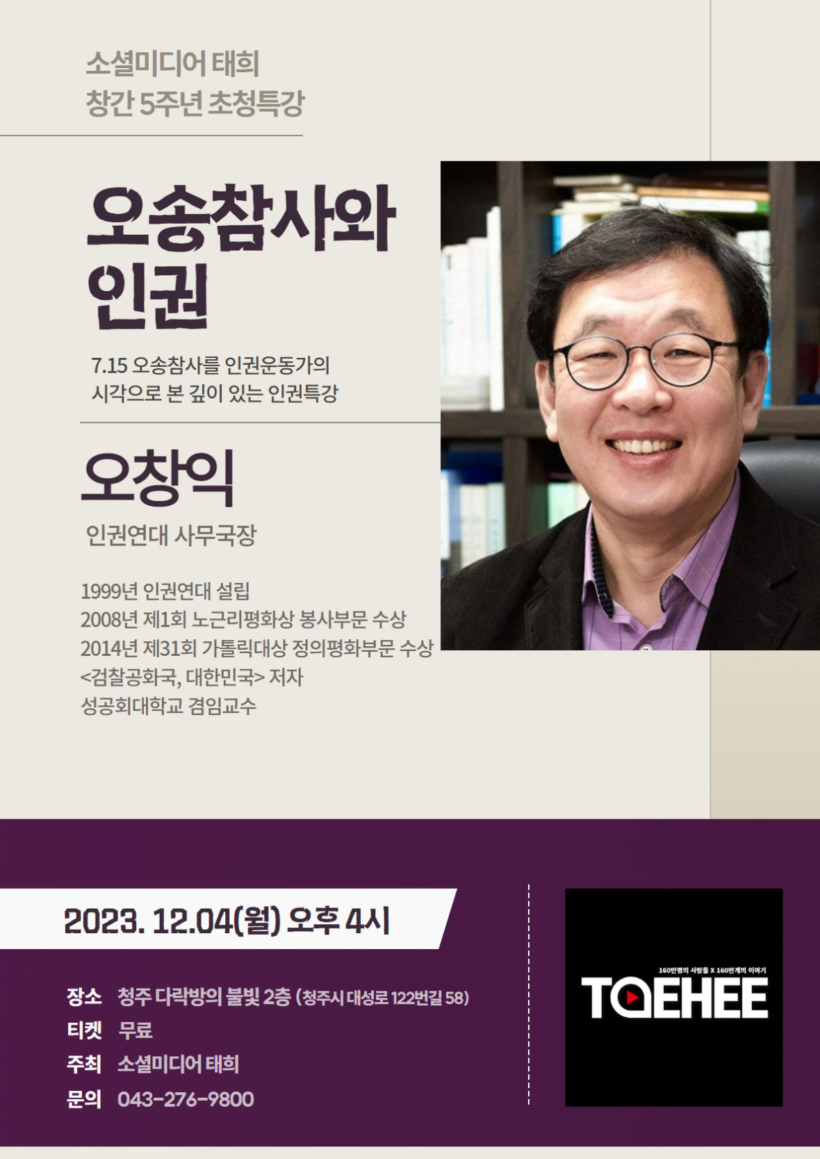 태희 창간5주년 기념 오창익 인권연대 사무국장... 12월 4일 오후 4시 다락방의불빛