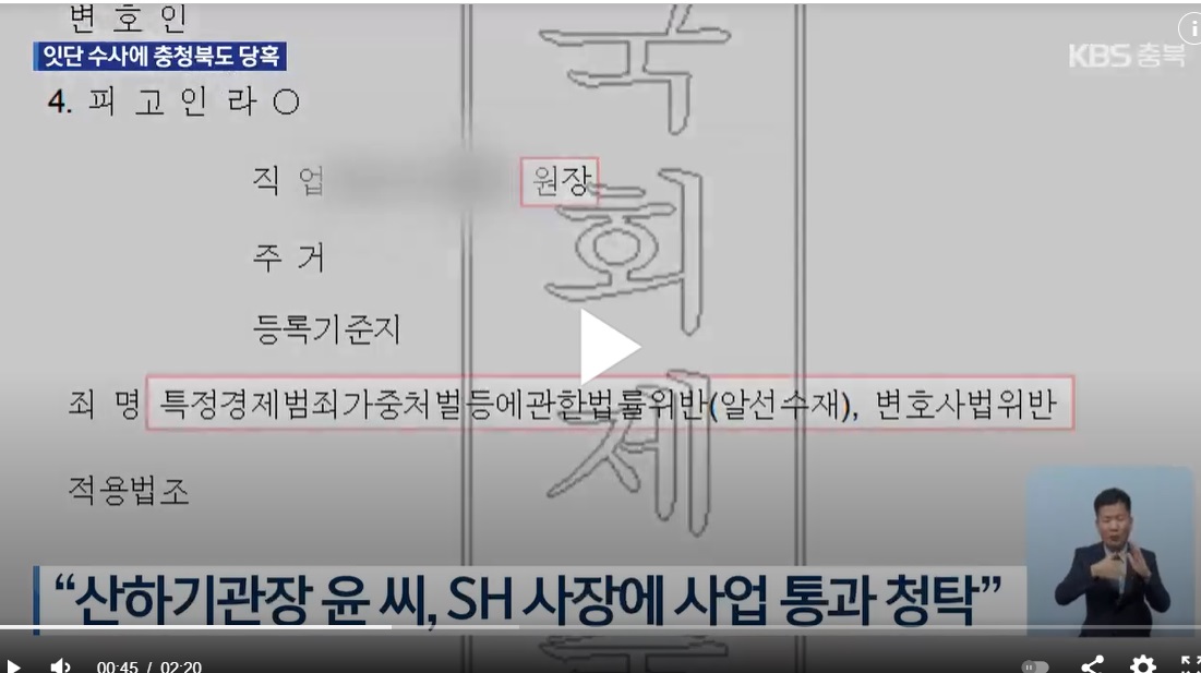 KBS충북이 입수한 검찰의 공소장에 따르면 윤 원장은 지난 2016년 서울주택도시공사(SH) 사장에게 A사의 임대주택 사업심의 통과를 청탁했고, 이 대가로 3700만원을 받았습니다.