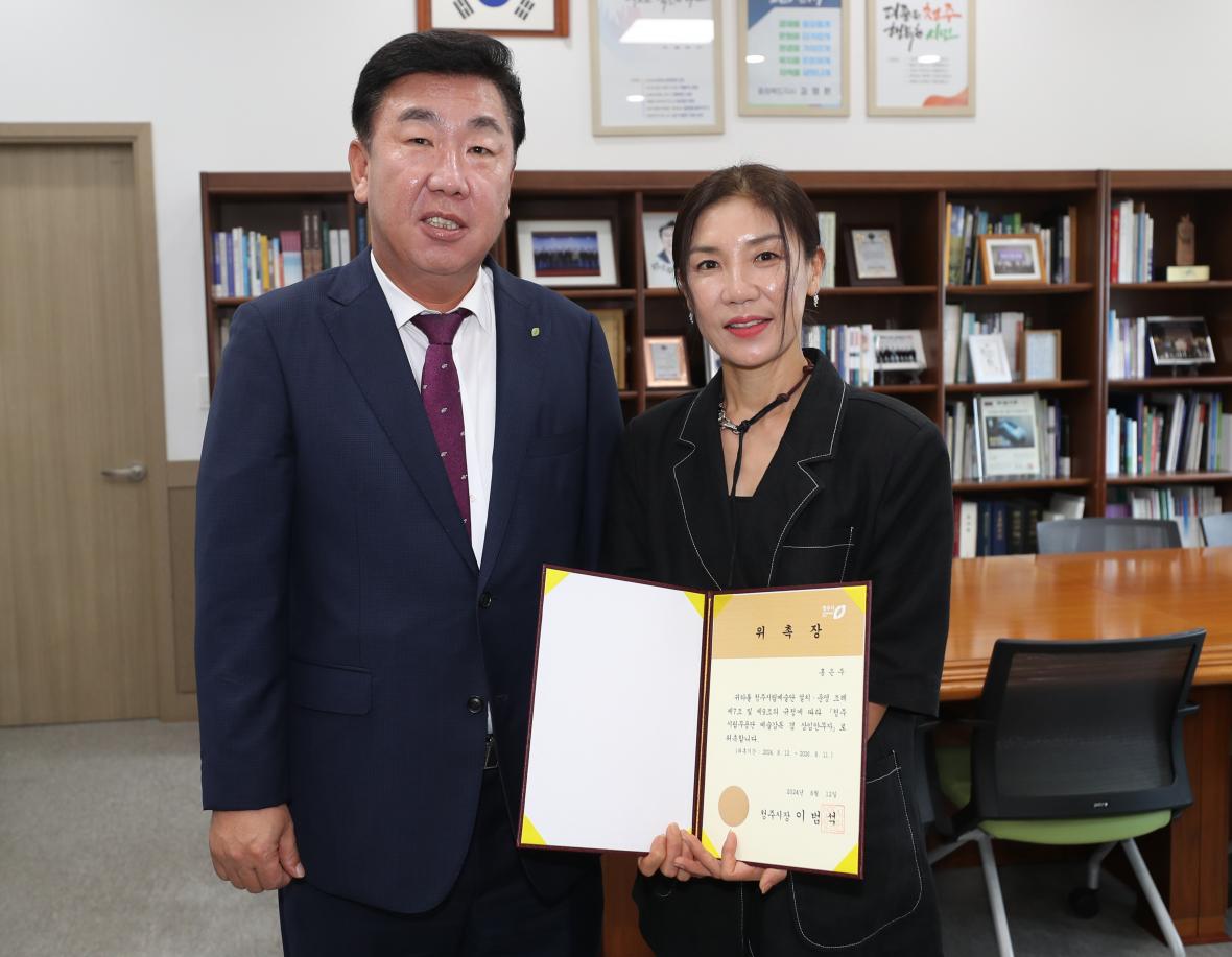 홍은주 청주시립무용단 예술감독이 12일 이범석 시장으로부터 위촉장을 받고 기념촬영을 하고 있다. /청주시제공