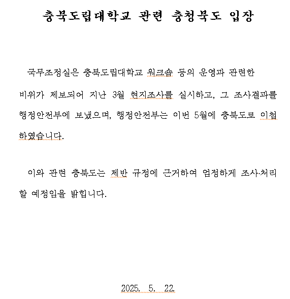 이에 대해 충북도는 이날 오후 ‘충북도립대학교 관련 충청북도 입장’을 발표하고 엄정하게 조사·처리하겠다고 밝혔습니다.