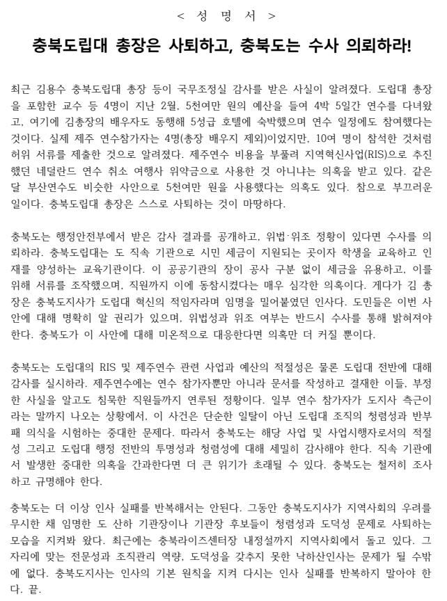 충북참여자치시민연대는 “참으로 부끄러운 일이다. 충북도립대 총장은 스스로 사퇴하는 것이 마땅하다”고 했습니다.