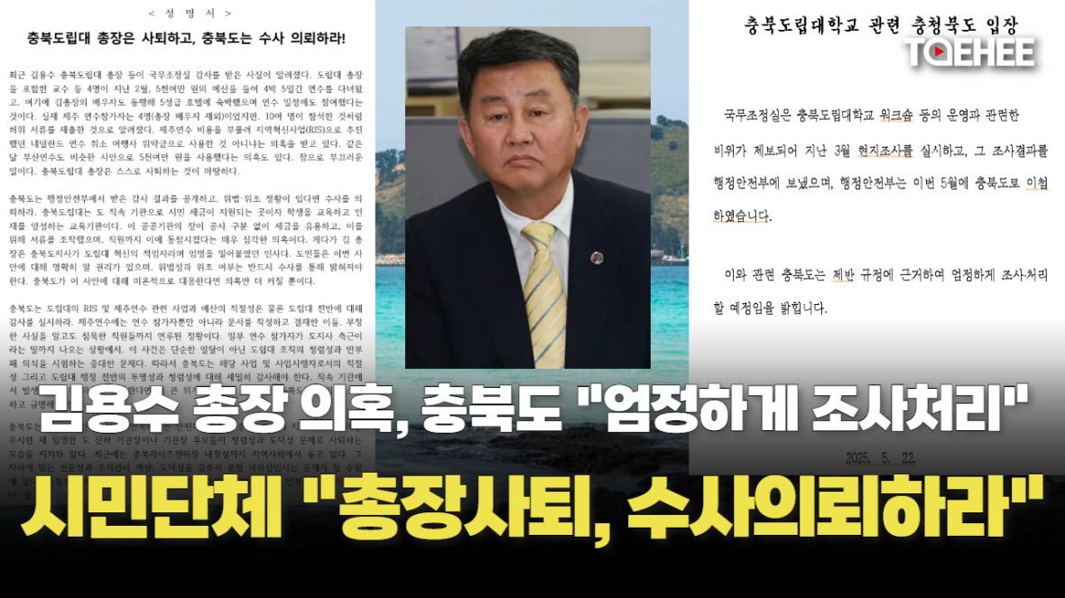 특히 충북참여자치시민연대는 “김 총장은 충북도지사가 도립대 혁신의 적임자라며 임명을 밀어붙였던 인사”라면서 “직속 기관에서 발생한 중대한 의혹을 간과한다면 더 큰 위기가 초래될 수 있다”고 경고했습니다.