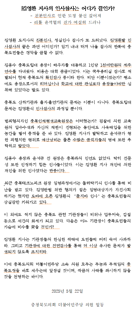 민주당 충북도의원들 성명서 전문민주당 소속 충북도의원들도 성명서를 내고 “김영환 지사의 인사참사는 어디가 끝인가”라고 질타했습니다.