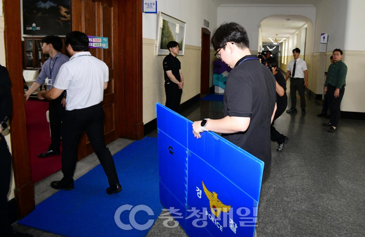 21일 경찰 수사관들이 김영환 충북지사 집무실에 압수수색을 위해 들어가고 있다./충청매일 제공