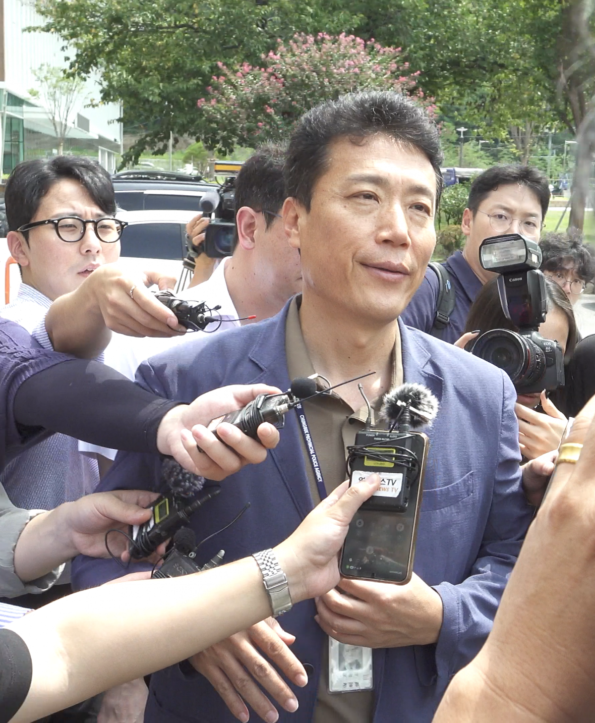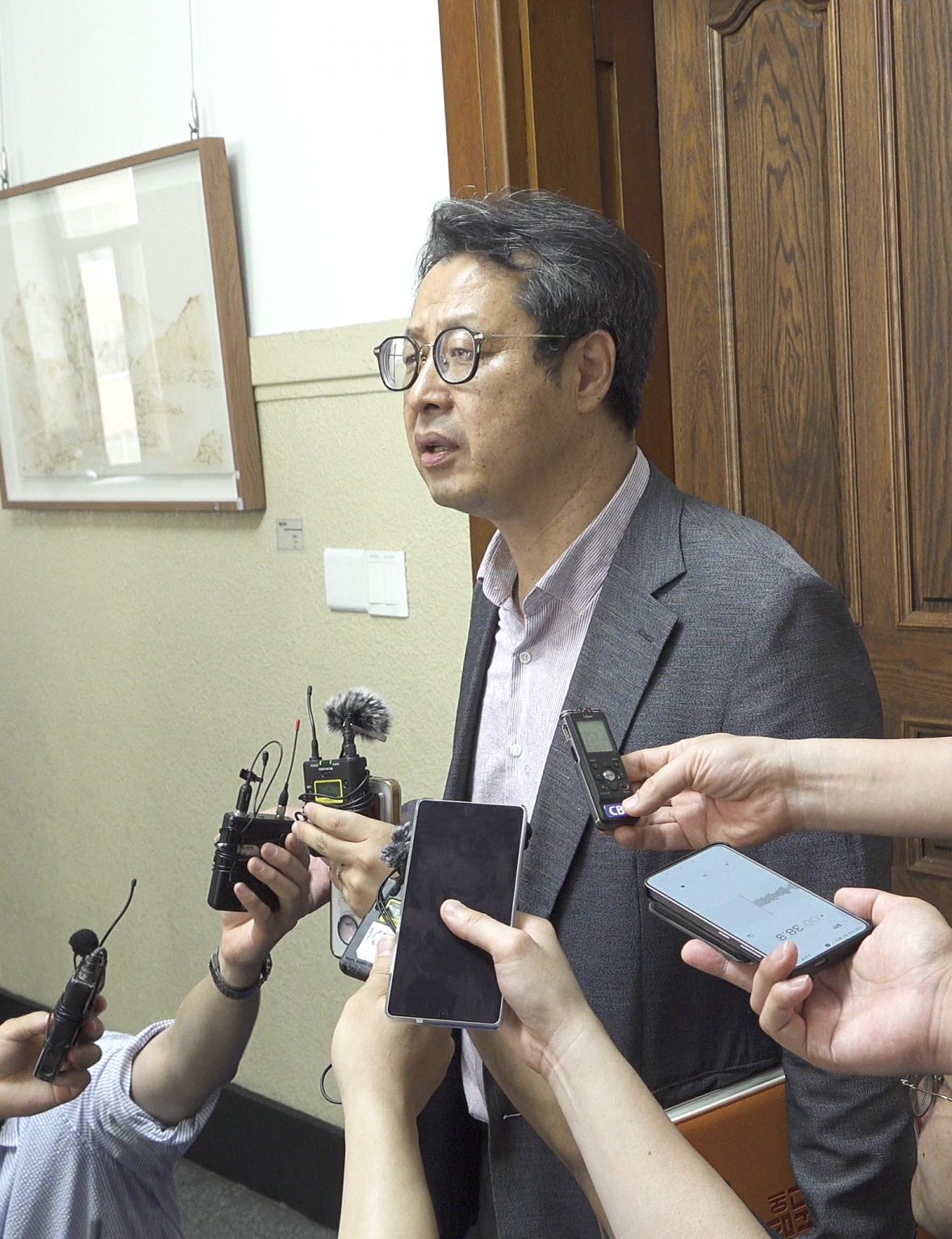 21일 김병태 충북도 대변인이 압수수색과 관련한 김 지사의 입장발표 계획에 대해 설명하고 있다./미디어태희