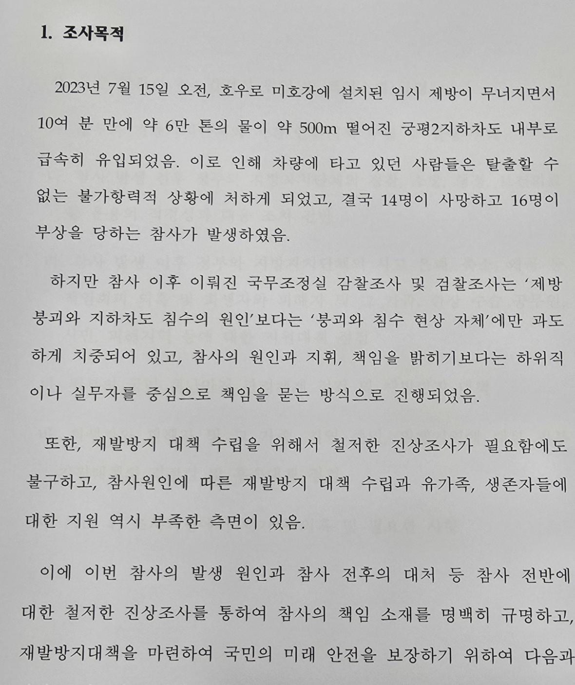 특히 오송참사 국정조사 계획서는 “참사이후 이뤄진 국무조정실 감찰 조사 및 검찰조사는 ‘제방붕괴와 지하차도 침수의 원인’보다는 ‘붕괴와 침수 현상 자체’에만 과도하게 치중되어 있고, 참사의 원인과 지휘, 책임을 밝히기보다는 하위직이나 실무자를 중심으로 책임을 묻는 방식으로 진행됐다”고 적시했습니다.