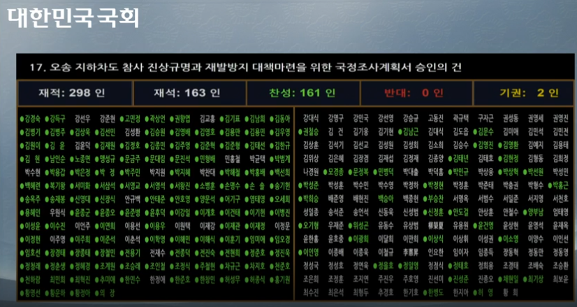 오송참사 국정조사계획서 승인 투표현황./국회 인터넷방송 캡쳐