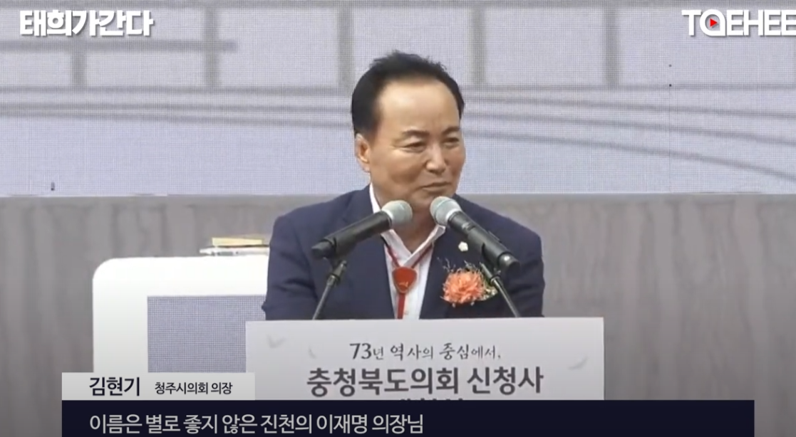 지난 1일 김현기 청주시의회 의장이 충북도의회 개청식에서 "이름은 별로 좋지 않은 진천의 이재명 의장님"이라고 발언해 파문이 커졌다./미디어태희