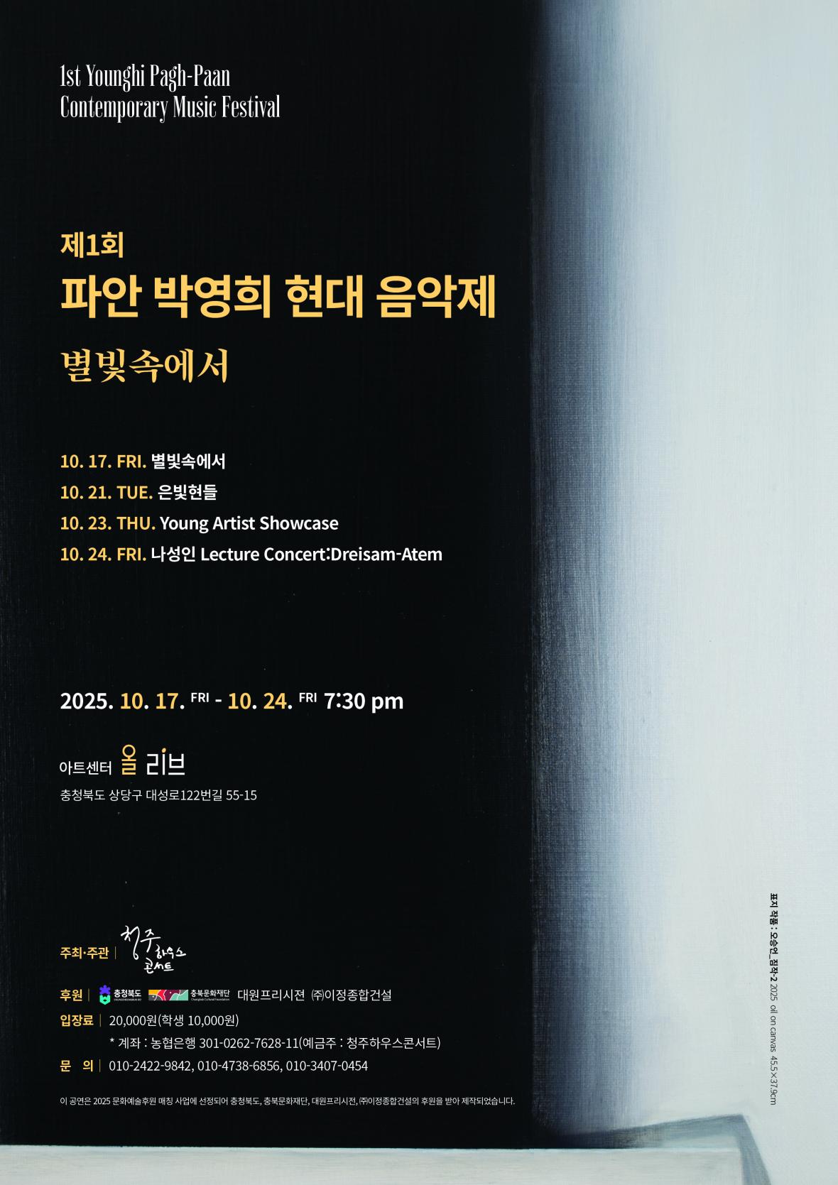 이어 17일 ‘별빛 속에서’, 21일 ‘은빛현들’, 23일 ‘Young Artist Showcaes’, 24일 ‘나성인 Lecture Concert’로 매일 저녁 7시 30분에 열립니다.