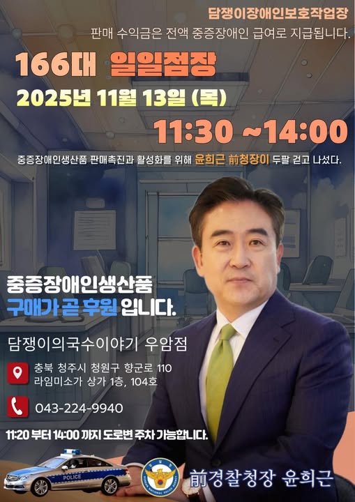 윤 전 청장은 오는 13일 ‘담쟁이의 국수이야기’ 우암점에서 일일점장으로 봉사합니다.
