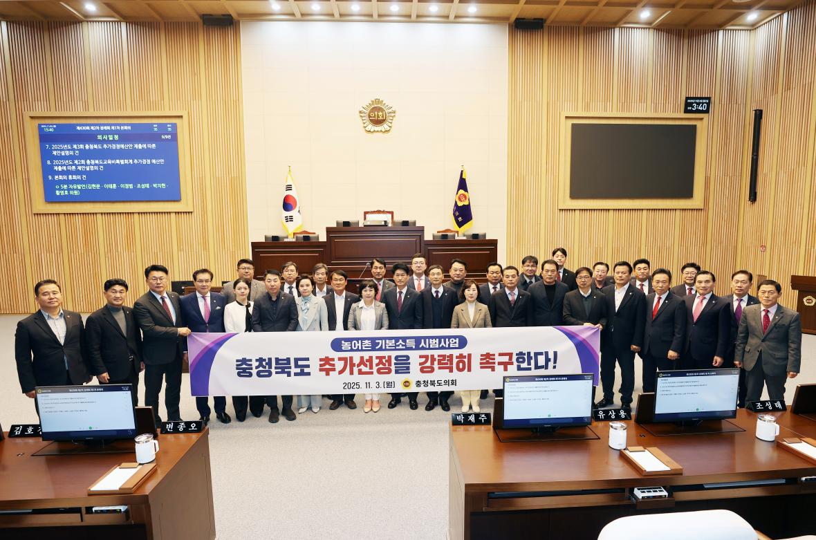 지난 3일 충북도의회가 농어촌 기본소득 시범사업 충북 추가선정 촉구 건의문을 채택한 뒤 기념촬영을 하고 있다./충북도의회 제공