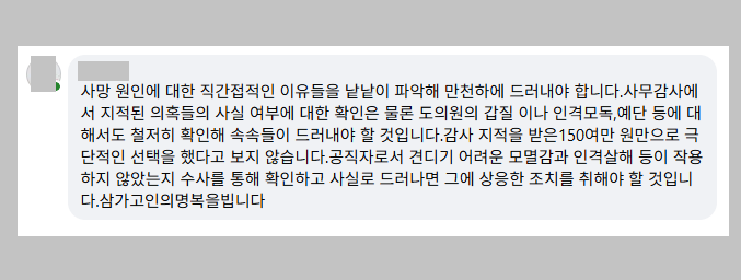 게다가 김 지사의 글에 대해 B씨는 “사무감사에서 지적된 의혹들의 사실 여부에 대한 확인은 물론 도의원의 갑질이나 인격모독, 예단 등에 대해서도 철저히 확인해 속속들이 드러내야 할 것”이라고 주장하기도 했습니다.