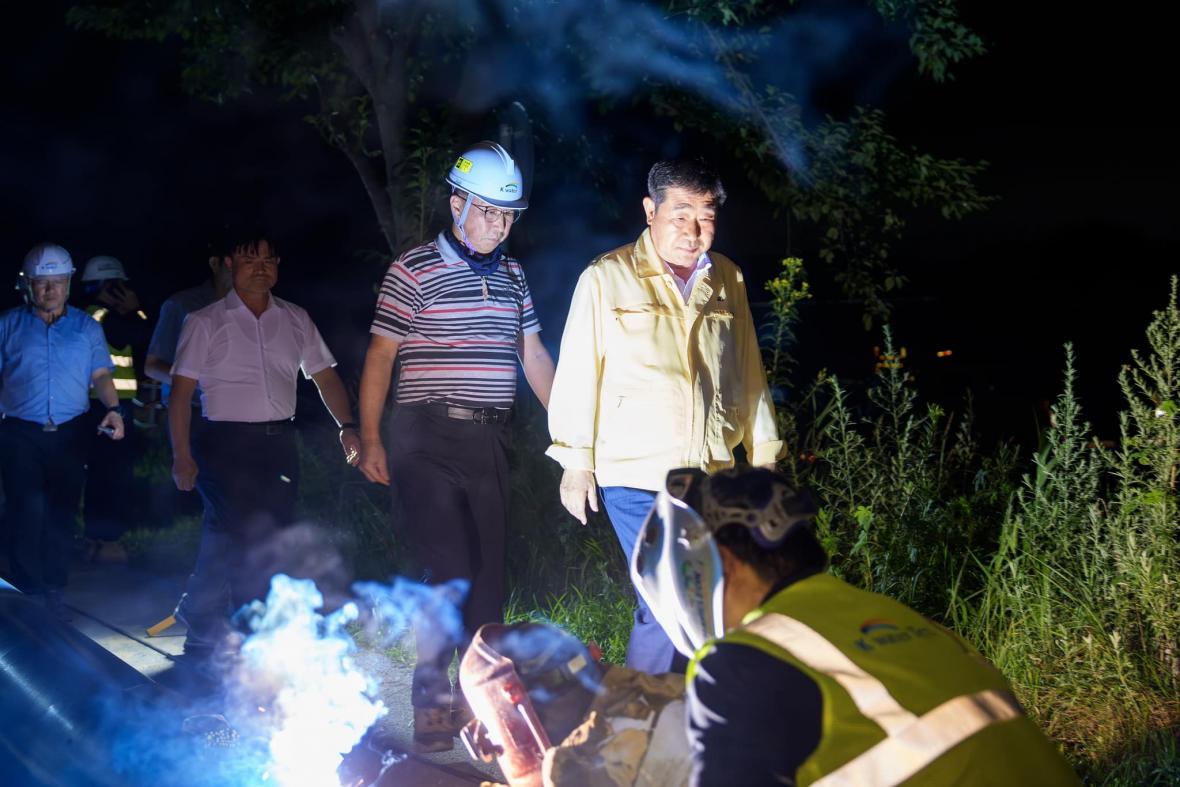 지난 8월 단수사태가 이재영 증평군수가 밤늦게 송수관로 응급복구 현장을 점검하고 있다./이재영 군수 페이스북