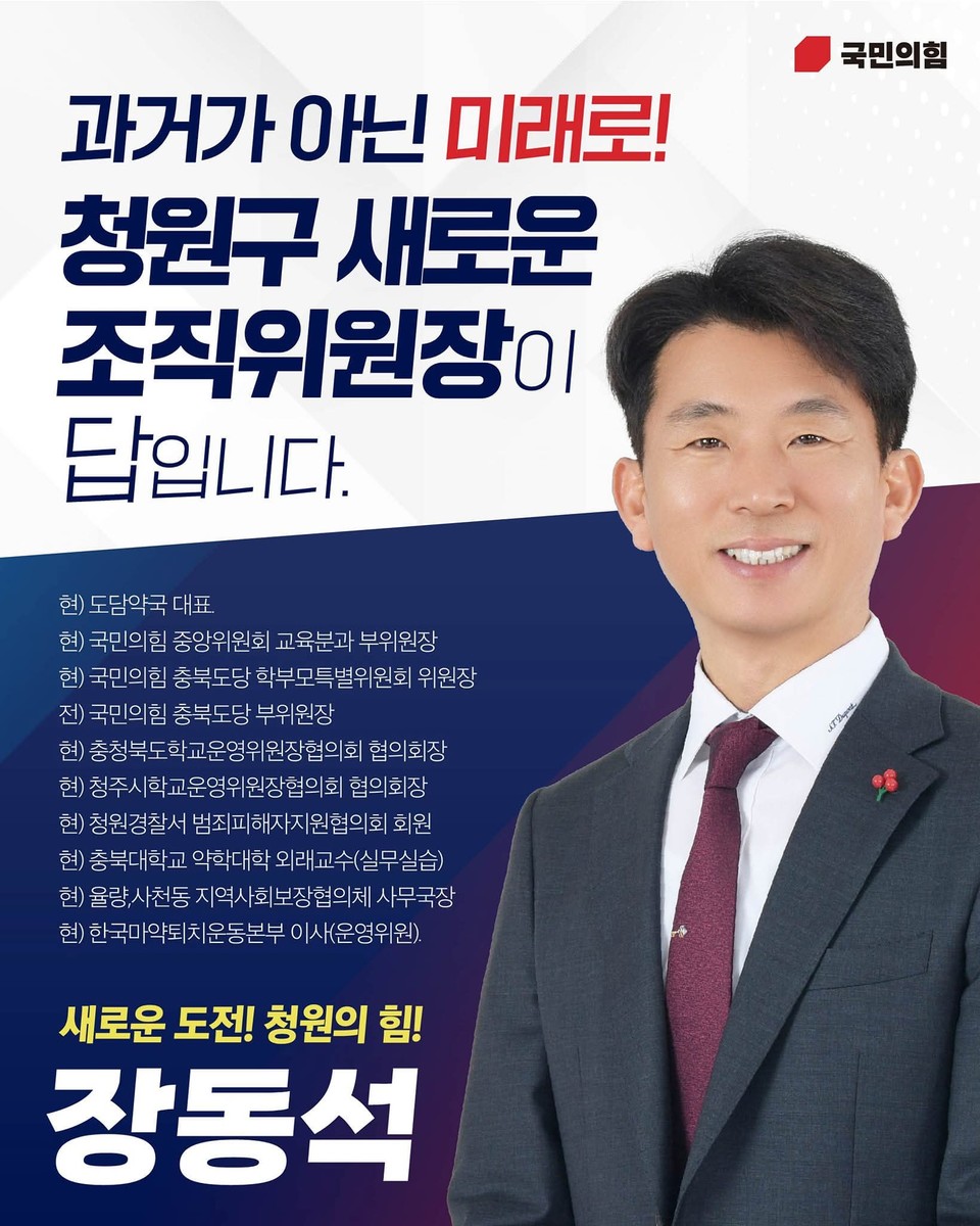 장 회장은 최근 국민의힘 중앙당과 충북도당에서 당직을 맡고 있는 사실이 드러나면서 논란을 불러 일으킨 바 있습니다.