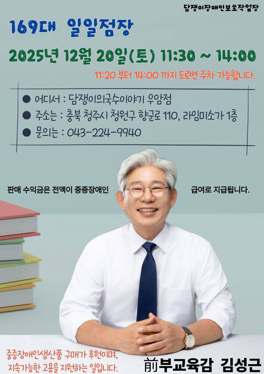이어 김성근 전 충북부교육감은 오는 20일 오전 11시 30분부터 오후 2시까지 같은 장소에서 169대 일일점장으로 활동합니다.