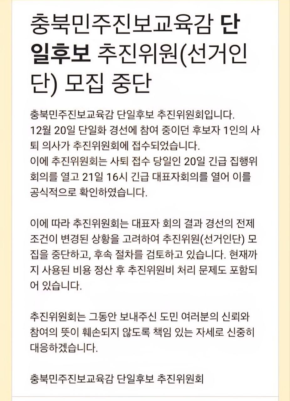 충북민주진보교육감 단일화 추진위원회(단일화 추진위)는 지난 21일 “20일 후보자 1인의 사퇴의사가 추진위원회 접수됐고, 21일 긴급 대표자회의에서 이를 공식적으로 확인했다”며 “추진위원(선거인단) 모집을 중단하고 후속절차를 검토하고 있다”고 밝혔습니다.