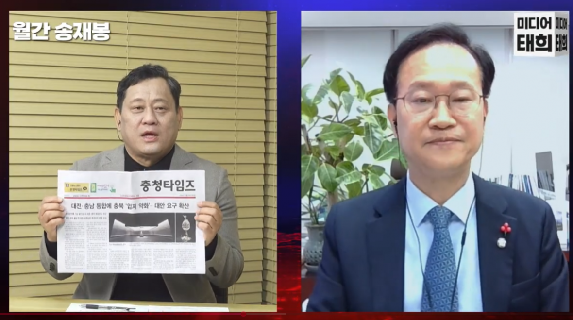 23일 송재봉 국회의원(온른쪽)이 미디어태희의 '월간 송재봉'에 출연해 대전충남통합과 관련해 인터뷰를 하고 있다./미디어태희