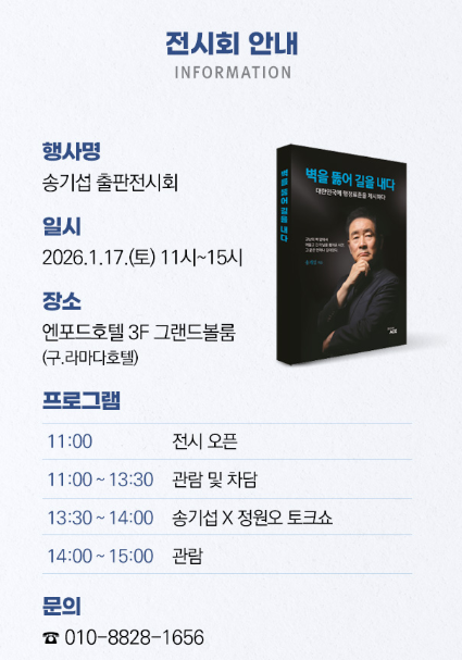 송 군수는 자신의 책 ‘벽을 뚫어 길을 내다-대한민국에 행정표준을 제시하다’ 출판전시회에서 진천군수 3선 행정가의 경력과 비전에 대해 설명할 예정입니다.