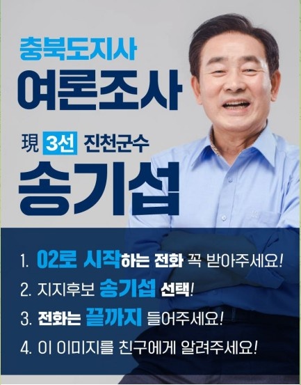 충북지사 출마를 선언한 송기섭 진천군수는 ‘02로 시작하는 전화 꼭 받아달라’, '지지후보 송기섭 선택' 등의 내용을 담은 게시물을 SNS에 전파하고 있습니다.