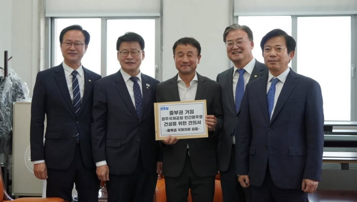 지난 해 한병도 국회 예결위원장에게 중부권 거점 청주국제공항 민간활주로 건설을 위한 건의서를 전달한 충북 국회의원들.