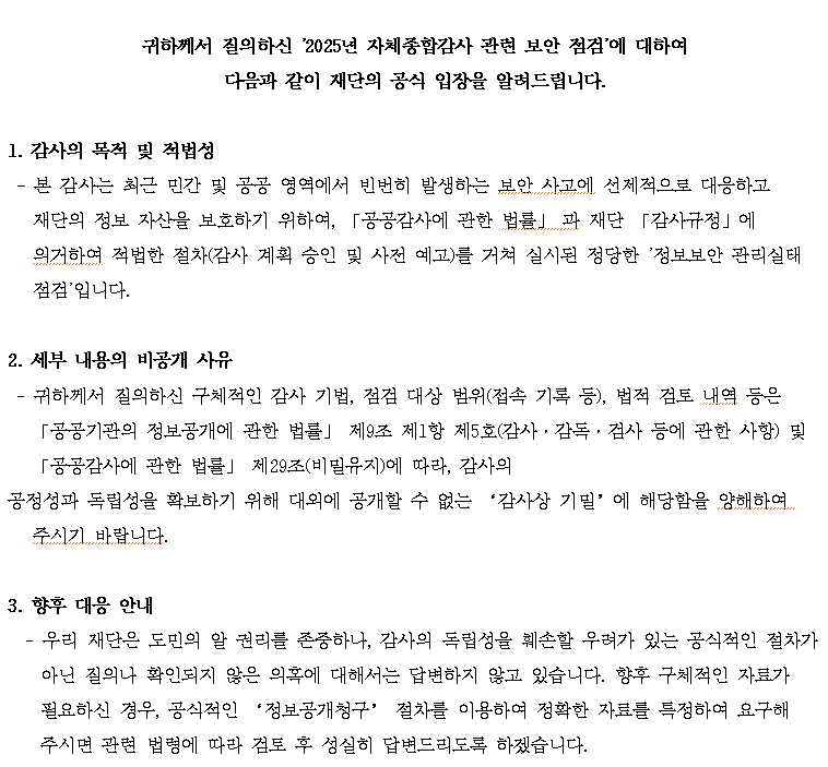 또한 “질의내용은 감사의 공정성과 독립성을 확보하기 위해 대외에 공개할 수 없는 감사상 기밀에 해당한다”며 “공식적인 정보공개청구 절차를 이용하여 정확한 자료를 특정하여 요구해 주면 관련 법령에 따라 검토 후 성실히 답변드리도록 하겠다”고 답변했습니다.