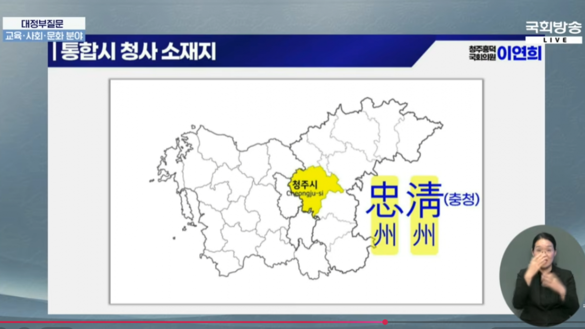 11일 이연희 의원이 대정부질문에서 충청권 4개시도 통합청사로 청주시를 제안했다./국회방송