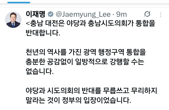 이 대통령은 “천년의 역사를 가진 광역 행정구역 통합을 충분한 공감없이 일방적으로 강행할 수는 없다”며 "야당과 시도의회의 반대를 무릅쓰고 무리하지 말라는 것이 정부의 입장이었다”라고 썼습니다.