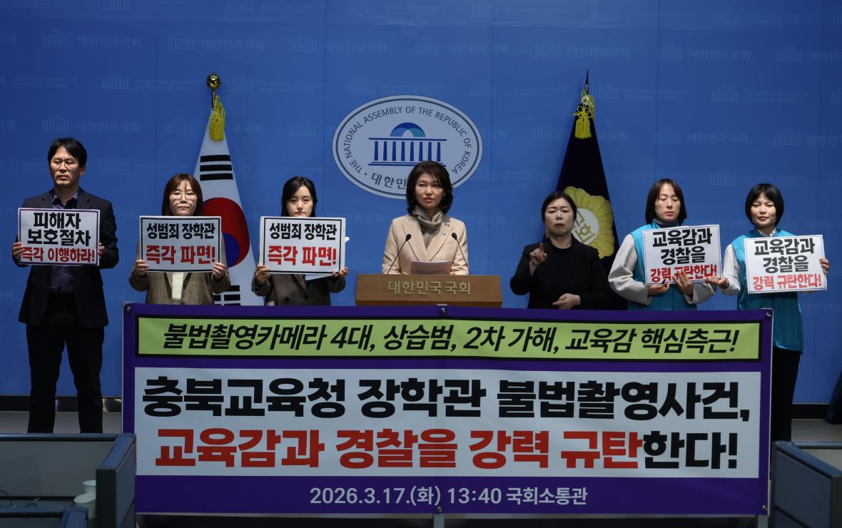 17일 조국혁신당 강경숙 국회의원과 111개 단체들은 국회 소통관에서 ‘충북교육청 A장학관 화장실 불법촬영 관련 111개 연대단체 규탄 기자회견’을 열었습니다.