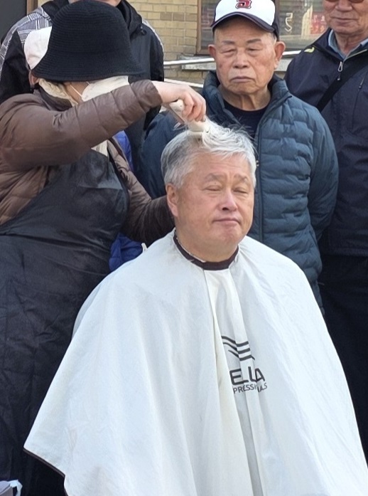 연규순 일하는 밥퍼 사업단장이 23일 오전 도청 입구에서 삭발을 하고 있다.