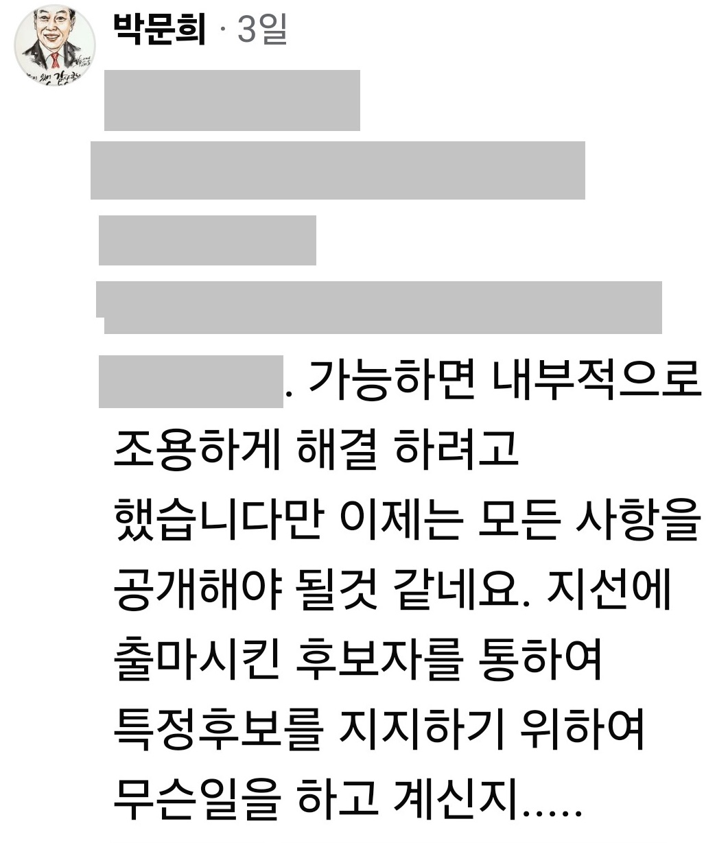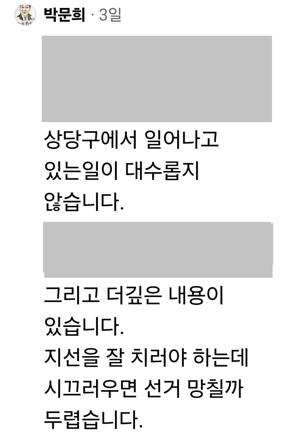 그러나 박 상임고문은 “상당구에서 일어나고 있는 일이 대수롭지 않다”며 “그리고 더 깊은 내용이 있다”고 추가로 댓글을 달았습니다.
