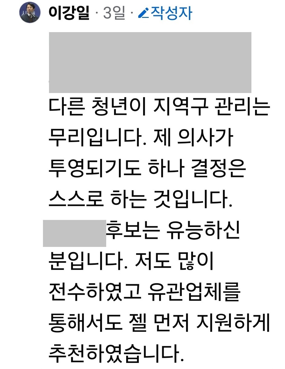 이 의원은 “000후보는 유능하신 분이다. 저도 많이 전수하였고, 유관업체를 통해서도 제일 먼저 지원하게 추천했다”고 밝혔습니다.